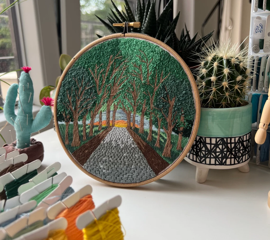Схема вышивки гладью "Деревья, дорога и закат". Вышитая картина.